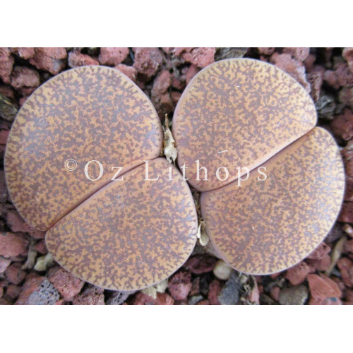 Lithops lesliei ssp. lesliei v. mariae C141. Mossy brown patterns on an dull orange face. Location - 10 km South West of Boshof, South Africa.