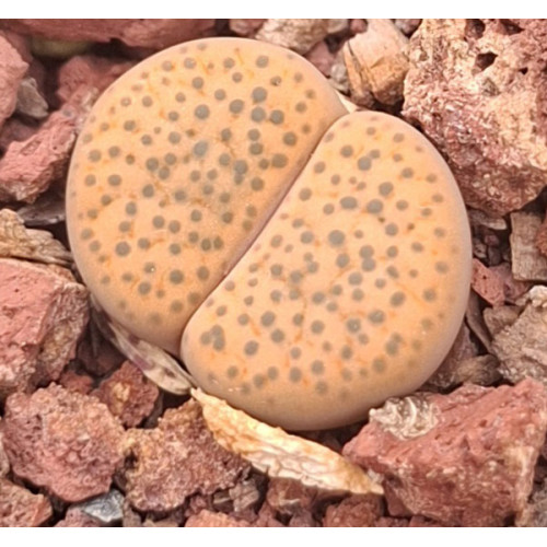 Lithops fulviceps v. fulviceps C220. Ochre bodies, many dots. Location: 75 km North of Karasburg, Namibia.