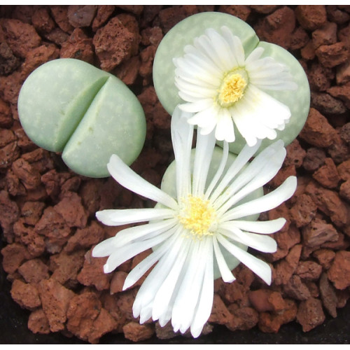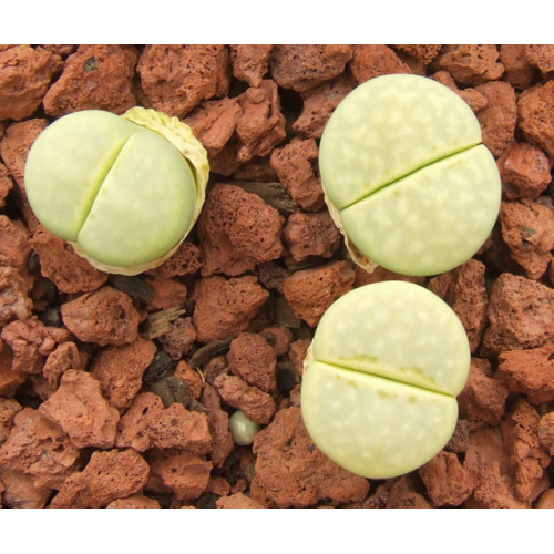 Lithops julii ssp. julii 'Peppermint Creme' C297A. (Also spelt 'cream') Unusual green form julii. Location - 45 km South East of Warmbad, Namibia.