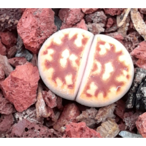 Lithops 'Lava Flow'. Lithops karasmontana subsp. karasmontana var. tischeri X Lithops karasmontana subsp. karasmontana var. lericheana. Strong rubrications in this karasmontana hybrid.