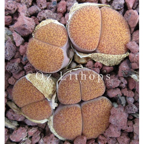 Lithops lesliei ssp. lesliei v. mariae C141. Mossy brown patterns on an dull orange face. Location - 10 km South West of Boshof, South Africa.