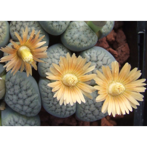 Lithops verruculosa v. verruculosa C178. Milky grey tinged pink. Beautiful flowers from pale lemon through to pale pink. Location - 90 km West of Kenhardt, South Africa.