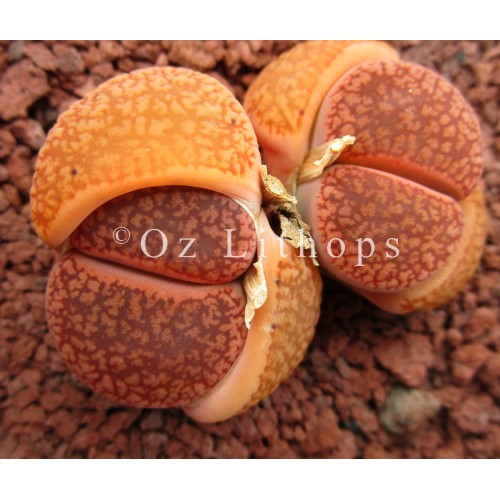 Lithops aucampiae 'Rudesheim Ruby'. "A fine saturated red var. aucampiae” discovered by Jossie Brandt. Varies from solid to lined face. Previously described in error as 'Firebrandt'.