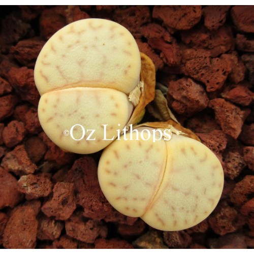 Lithops vallis-mariae TOK059. Location: 5 km East North East of Mariental, Namibia. Rough skinned. Variable: immaculately ivory to well marked tan. Can be difficult.(NOW 20 seeds per packet)