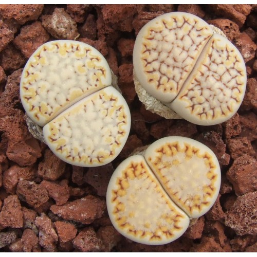 Lithops julii ssp. fulleri v. rouxii C215. Mustard border. Location - 75 km West South West of Warmbad, Namibia.