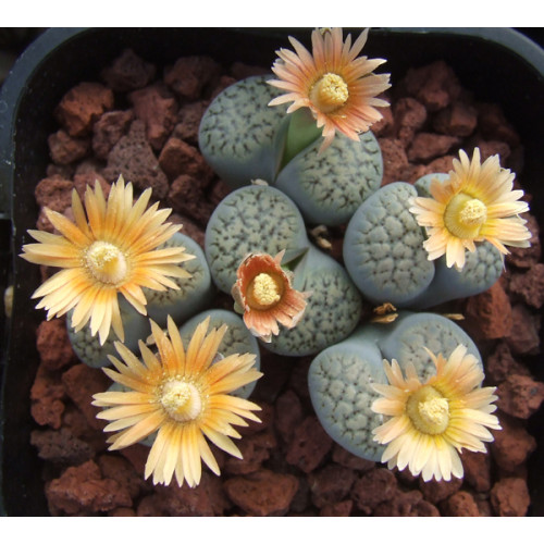Lithops verruculosa v. verruculosa C178. Milky grey tinged pink. Beautiful flowers from pale lemon through to pale pink. Location - 90 km West of Kenhardt, South Africa.