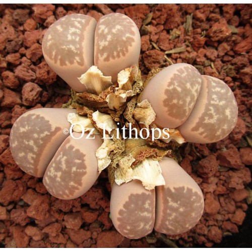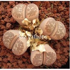 Lithops marmorata v. marmorata (syn. framesii) C365. Odd colours, including some pink/orange. Location - 60 km North East of Springbok, South Africa.
