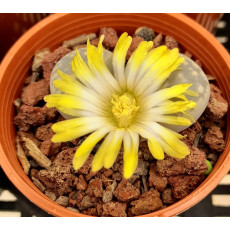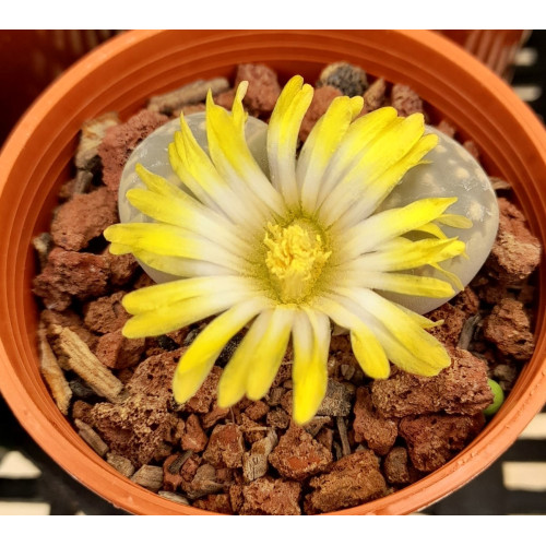 Lithops marmorata var. marmorata 'Geel Blom'. Recently published cultivar that has been grown in South Africa for quite some time. A yellow flowered, often white centred, var. marmorata with normal body colours. ‘Geel Blom’ is Afrikaans for “yellow flower”.