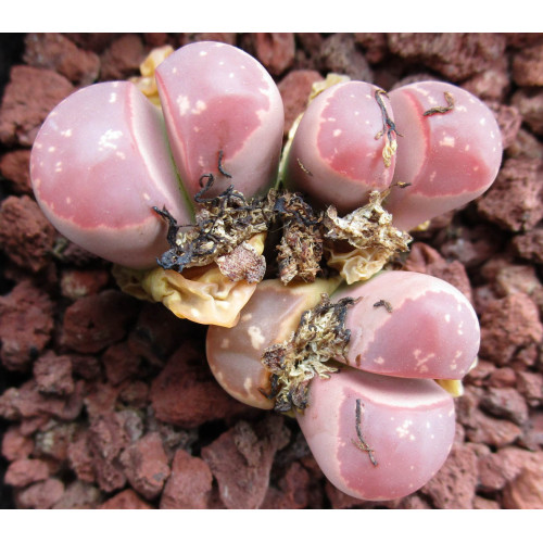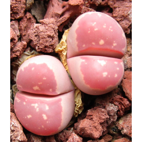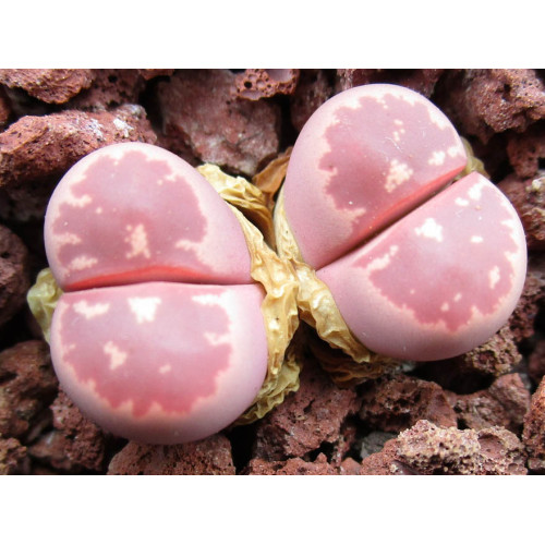 Lithops olivacea v. nebrownii 'Red Olive'. A red cultivar of olivacea. Variation in the red pigment is common with some being more "red" than others.(NOW 20 seeds per packet)